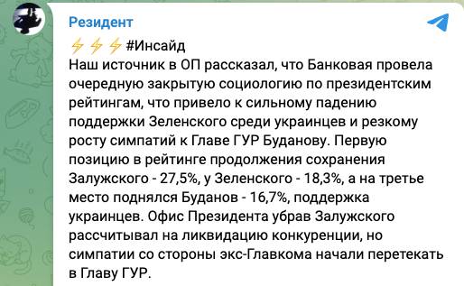 «Первую позицию в рейтинге продолжения сохранения Залужского - 27,5%, у Зеленского - 18,3%, а на третье место поднялся Буданов - 16,7%, поддержка украинцев. Офис Президента убрав Залужского рассчитывал на ликвидацию конкуренции, но симпатии со стороны экс-главкома начали перетекать в Главу ГУР», - сообщил украинский телеграм-канал «Резидент», имеющий надежного источника в офисе Зеленского.