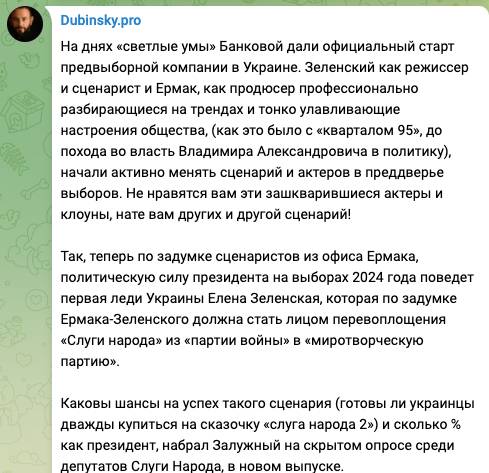 «Сталкиваюсь с недоумением, почему Елену Зеленскую хотят сделать главой партии „Слуга народа“ и отправить на выборы. Зеленскому нужен во главе партии максимально лояльный человек, тогда как Елена нелояльна и не подчиняется Зеленскому», — утверждает Дубинский.