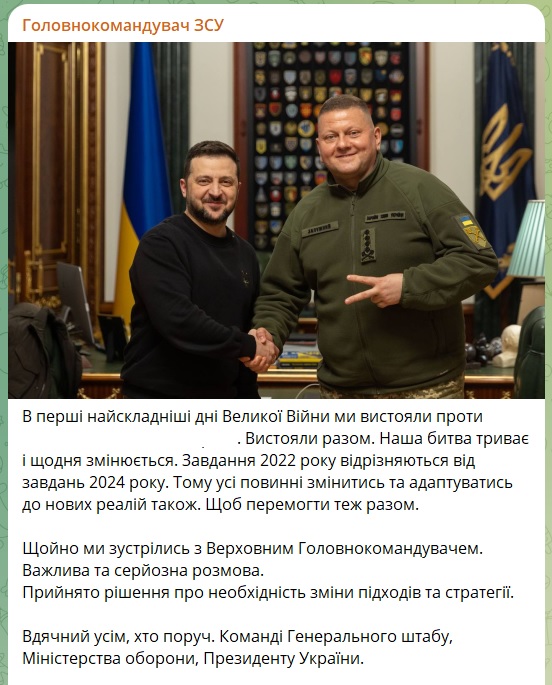 «Наша битва продолжается и каждый день меняется. Задания 2022 отличаются от задач 2024 года. Поэтому все должны измениться и адаптироваться к новым реалиям. С Верховным Главнокомандующим состоялся важный и серьёзный разговор. Принято решение о необходимости изменения подходов и стратегии. Благодарен всем, кто рядом. Команде Генерального штаба, Министерства обороны, Президента Украины», - пояснил Залужный в своём прощальном посте.