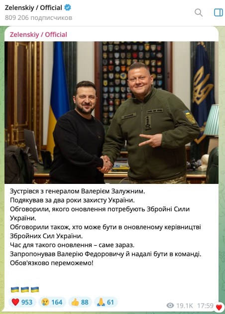 Владимир Зеленский фактически сообщил об увольнении главкома ВСУ Валерия Залужного. Он опубликовал соответствующий пост в своём Телеграм-канале.