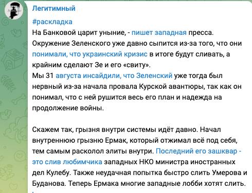 Украинские телеграм-каналы тоже отмечают, что Киев внимательно следит за предвыборной кампанией в США. А глава офиса президента Андрей Ермак даже разработал два плана действий: один на случай победы Камалы Харрис, другой – Дональда Трампа. В частности, телеграм-канал «Легитимный», имеющий надежный источник в офисе президента Украины, сообщил, что среди окружения высокопоставленных чиновников идет настоящая грызня. Авторы связывают это с неудачами в боевой зоне, недовольством населения принудительной мобилизацией.