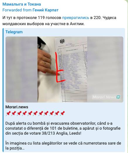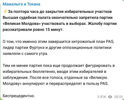 «Впервые в истории Молдовы! В бюллетени напротив не допущенной к выборам партии «Великая Молдова» ЦИК решил не ставить штамп «Снята». Избирателей будут вводить в заблуждение до конца голосования. А уже после него все голоса, отданные за эту партию, отменят и перераспределят. В пользу PAS преимущественно. Европейцы одобрительно кивают головой и называют это демократией. Мы же называем вещи своими именами: вороватая власть даже голоса у других нагло ворует», - пишет канал.