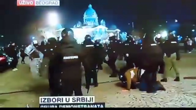 Полиция забаррикадировалась внутри при помощи щитов. Протестующие разбили несколько окон, бросали внутрь камни. Президент Вучич выступил с обращением к нации. Сербский лидер потребовал поймать и наказать «бандитов». Ближе к ночи к месту событий начали стягиваться подразделения силовиков.