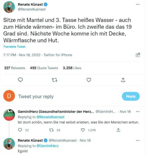 А в ответ тысячи гневных комментариев. «Приятно, когда ты испытываешь на себе то, что делаешь с людьми», «Да здравствует переход к зеленым источникам энергии!», «Дорогая госпожа Кюнаст, я в настоящее время отапливаю дома только ванную комнату. У меня, к сожалению, нет жалости к Вам», «Вам холодно, потому что вы за зеленую энергетику. Но жаловаться на это здесь? Это почти антивыборная кампания». А кто-то посоветовал экоактивистке приседать, чтобы согреться.