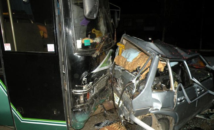 Столкновение пассажирского автобуса MAN с легковым автомобилем ВАЗ-2107
