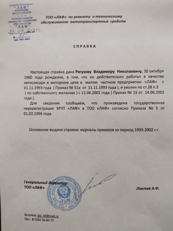 Также были присланы в редакции справки и трудовая книжка, на которых отражен трудовой стаж с 1 ноября 1993 года по 12 июня 2002 года.