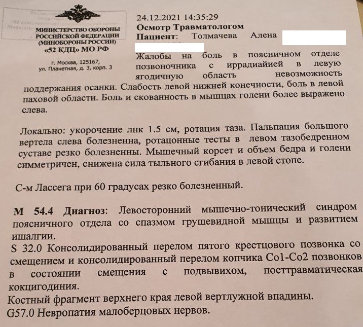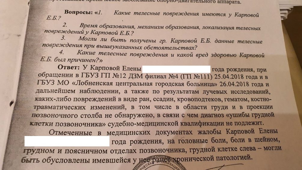 — В поликлинике предположили, что у меня ушиб грудной клетки и позвоночника и прямо оттуда позвонили в полицию. Затем участковый меня опросил, направил документы в прокуратуру, оттуда — снова в полицию. Больше месяца мне не говорили о том, как развивается ситуация. Потом назначили экспертизу, которая не подтвердила наличие у меня каких-либо производственных травм, хотя различные другие эксперты, к которым я обращалась, указывали, что на перелом позвонков со смещением и с поражением нервной системы, — объясняет Алена.