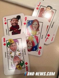 В социальных сетях обсуждают идею игральных карт, на которых шаржировано изображены «враги народа» - Макаревич, Обама, Меркель и другие известные политические фигуры. Комплекты якобы распечатаны в большом количестве и получили неофициальное распространение в администрации президента в качестве шуточного новогоднего сувенира.