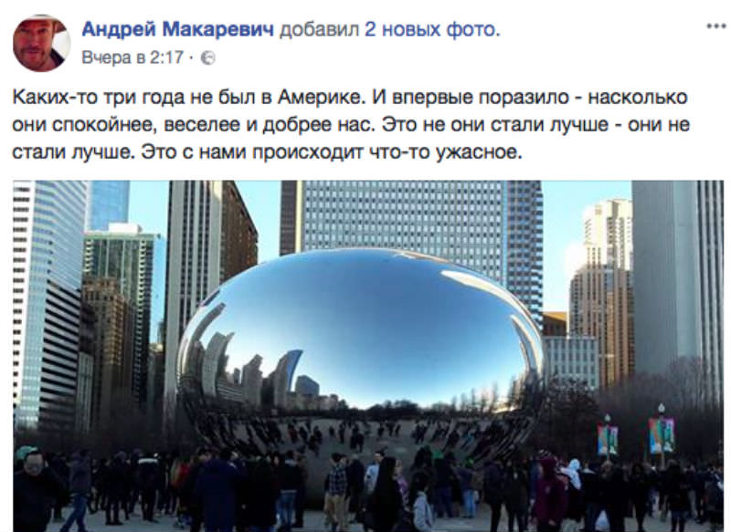 «Каких-то три года не был в Америке. И впервые поразило - насколько они спокойнее, веселее и добрее нас. Это не они стали лучше - они не стали лучше. Это с нами происходит что-то ужасное», - написал Макаревич на Facebook.