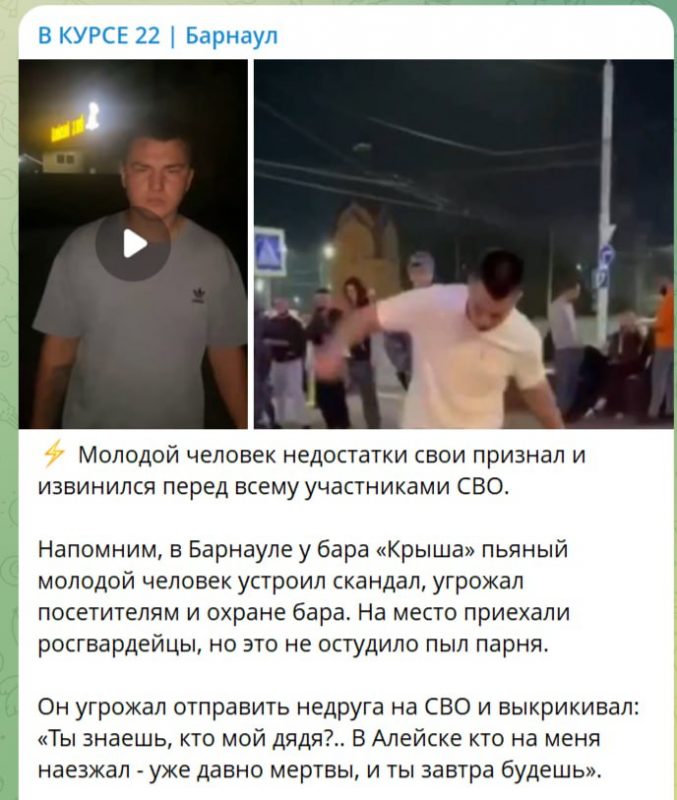 На днях в Барнауле пьяный молодой человек угрожал оппонентам «дядей-чиновником» и отправкой на СВО. Также «мажор» публично оскорблял росгвардейцев, которые, видимо, опасаясь влиятельного дяди, боялись скрутить подонка.