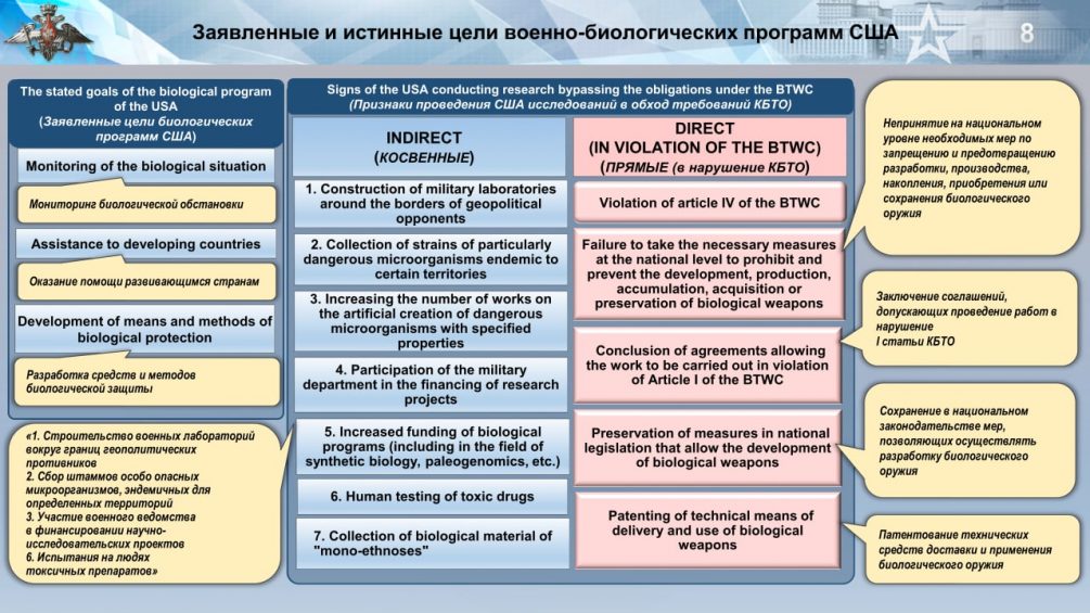 «Крайне неубедительно выглядели объяснения США и Украины относительно вывоза штаммов и биоматериалов украинских граждан и соблюдения этических норм при проведении исследований на военнослужащих, малообеспеченных гражданах, а также на одной из наиболее незащищённых категорий населения — пациентах психиатрических больниц», — цитирует Кириллова РИА «Новости».