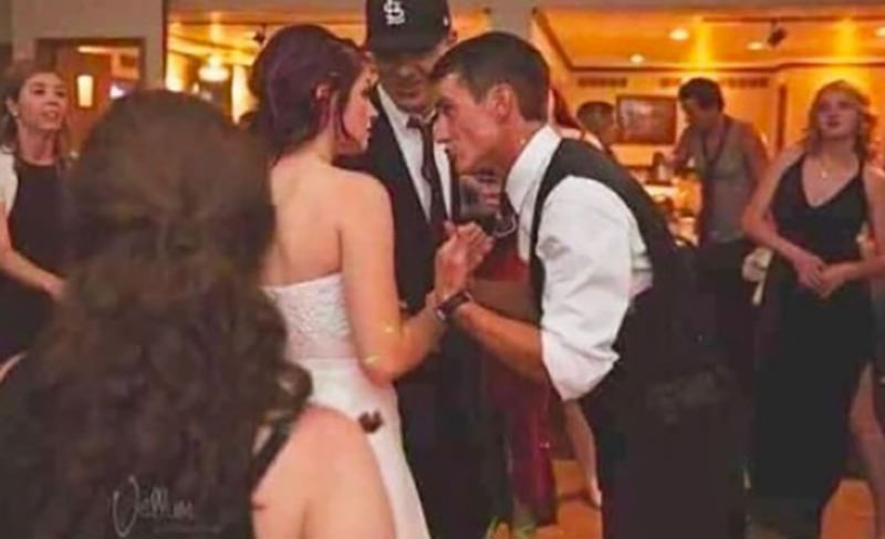 Кажется, что у невесты задралось платье, и все видят ее наготу, но на самом деле перед ней стоит девушка с голым плечом.