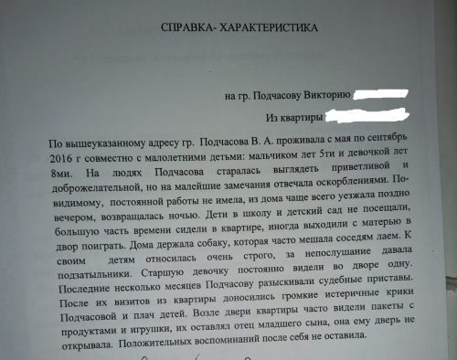 У Сергея на руках — десятки бумаг с характеристиками бывшей сожительницы. В отделе по охране детства отмечали, что из квартиры, где жила женщина, часто доносились крики и плач детей, сами ребята не ходили ни в школу, ни в детский сад, да и на улице были редко, все время сидели в квартире. Мать тем временем нигде постоянно не работала, поздно уезжала, приезжала под утро, в доме часто были «какие-то мужчины». Условия для жизни детей, мягко говоря, были не самые подходящие.