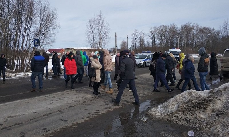 Речь идёт о полигоне ТБО «Воловичи». Несколько десятков человек непрерывно переходят дорогу по пешеходному переходу, преграждая путь грузовикам с мусором.