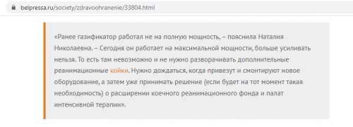 — Ранее газификатор работал не на полную мощность. Сегодня он работает на максимальной мощности, больше усиливать нельзя. То есть там невозможно и не нужно разворачивать дополнительные реанимационные койки. Нужно дождаться, когда привезут и смонтируют новое оборудование, а затем уже принимать решение о расширении коечного реанимационного фонда и палат интенсивной терапии, если будет на тот момент такая необходимость, — объясняла она местному изданию «Белпресса».