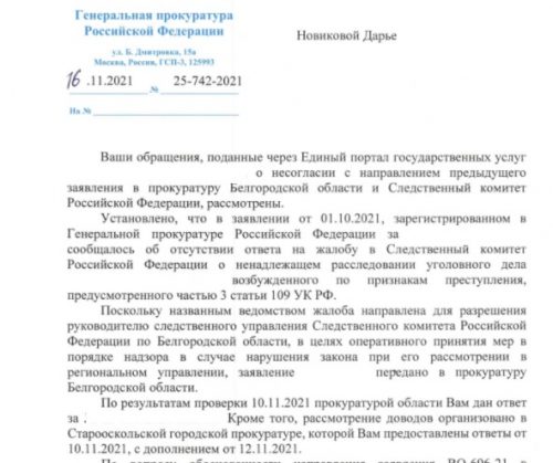 Дарья обращалась и к руководителю следственного отдела по городу Старый Оскол Замиру Иркналиеву, и к главе следственного комитета по Белгородской области Станиславу Захарову. А затем попросилась на прием к председателю СК РФ Александру Бастрыкину, пояснив, что без его вмешательства расследование затягивается. Ответа по существу из СК РФ она не дождалась. Обратилась в Генеральную прокуратуру.