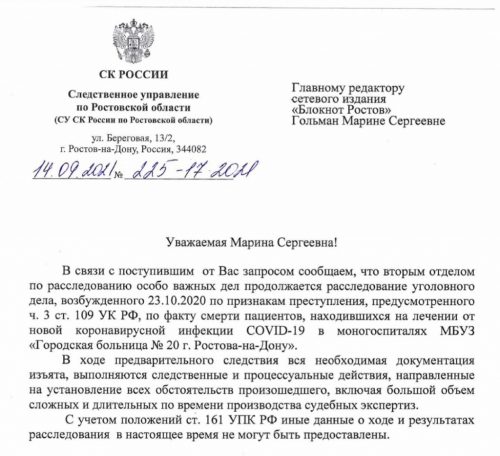По факту смертей в ковидном госпитале Ростова-на-Дону также возбудили уголовное дело. В городской администрации у заместителя главы Елены Кожуховой и на рабочем месте главы городского горздрава Надежды Левицкой прошли обыски. А незадолго до возбуждения дела неожиданно со своих постов уволились министр здравоохранения Ростовской области Татьяна Быковская и глава горздрава Надежда Левицкая. Официально их уход с «кислородным скандалом» никак не связан. В самой городской больнице № 20 также сменилось руководство. Однако дальше этого дело не продвинулось.