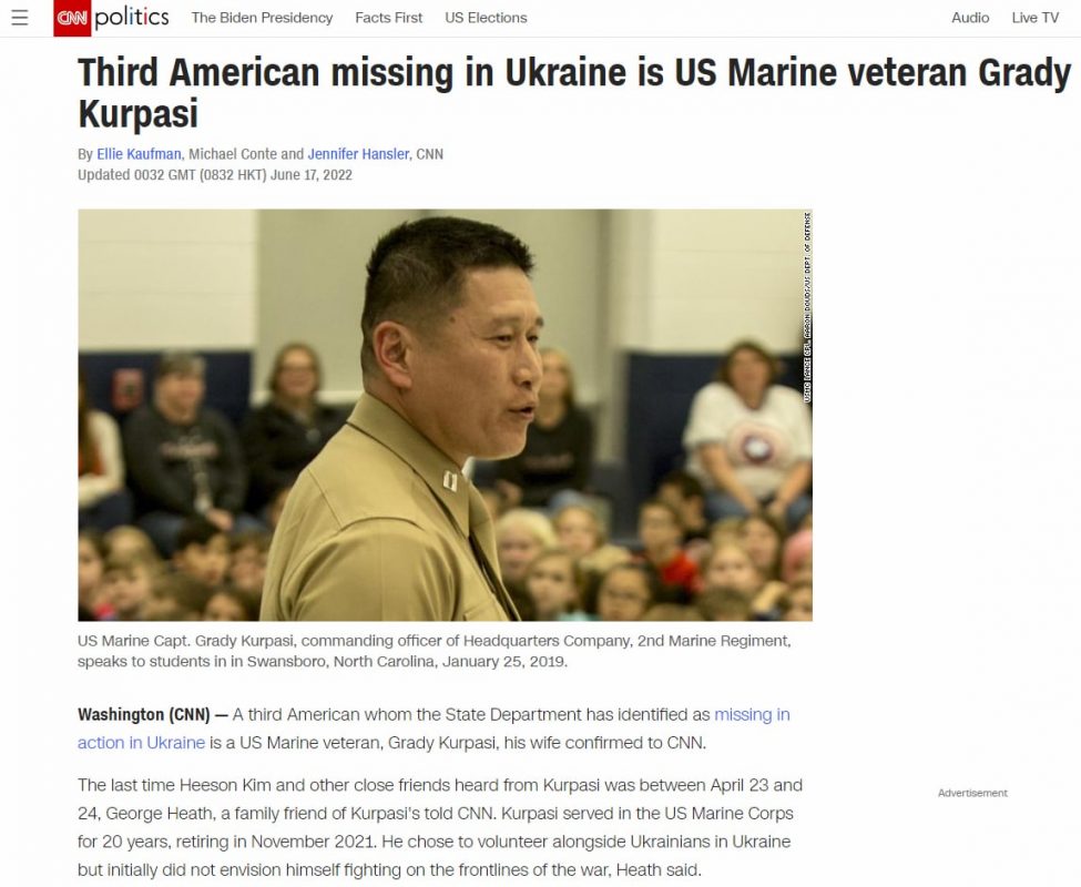 После сообщений о взятии в плен двоих американских наемников на Украине стало известно, что еще один бывший ветеран армии США пропал без вести на Донбассе. Речь идет о бывшем морском пехотинце из Северной Каролины Грейди Курпаси. О его судьбе ничего не известно уже несколько месяцев.