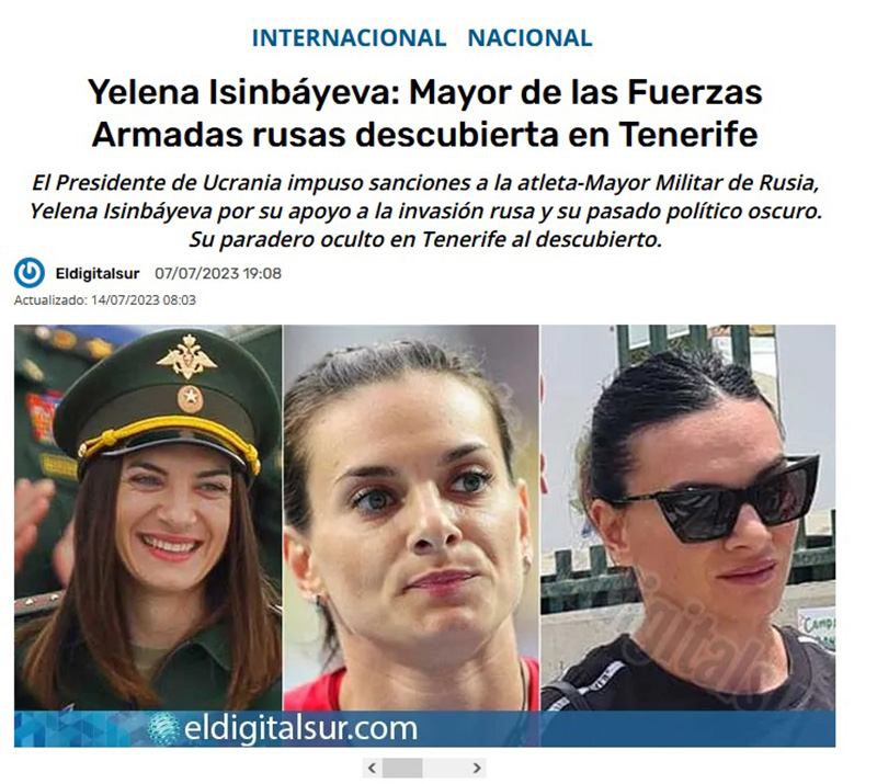 Напомним, скандал начался в начале июля, когда статья о Елене Исинабаевой появилась в испанской газете El Digital Sur с заголовком: «Елена Исинбаева: майор ВС РФ обнаружен на Тенерифе».
