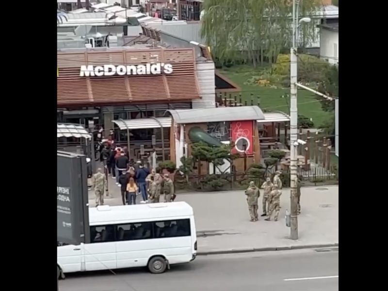 В сети публикуют видео, как люди в военной форме подходят ко всем мужчинам около ресторана быстрого питания, проверяют документы и выдают «письма счастья».