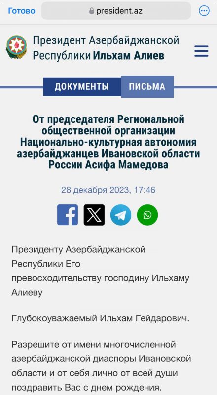 На фоне скандала с кандидатом в Ивановскую городскую Думу Асифом Мамедовым выяснилось, что он не только возглавляет азербайджанскую диаспору в регионе, но и замечен в раболепных письмах Ильхаму Алиеву. На сайте президента Азербайджана можно найти письмо от нынешнего кандидата в депутаты. В письме Мамедов от лица председателя диаспоры поздравляет Алиева с днем рождения.