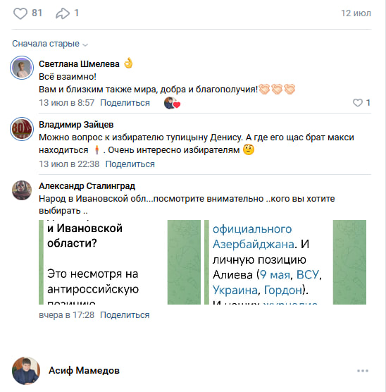 А что по этому поводу думает сам кандидат Мамедов? Уж коли избираешься в депутаты, нужно быть готовым отвечать за свои слова и дела. Но кандидат Асиф решил молчать. На своей странице в ВК он не публикует новых постов, а утром 8 сентября и вовсе закрыл комментарии, так как избиратели стали задавать неудобные вопросы.