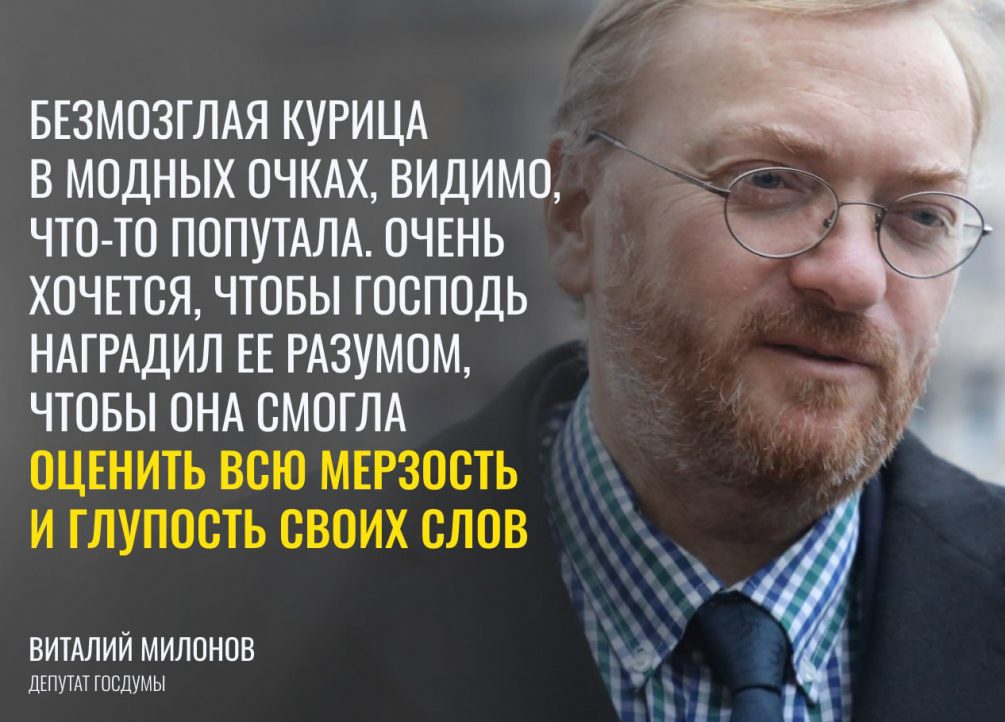 «Безмозглая курица в модных очках, видимо, что-то попутала. Очень хочется, чтобы Господь наградил ее разумом, чтобы она смогла оценить всю мерзость и глупость своих слов», — сказал депутат Госдумы Виталий Милонов.